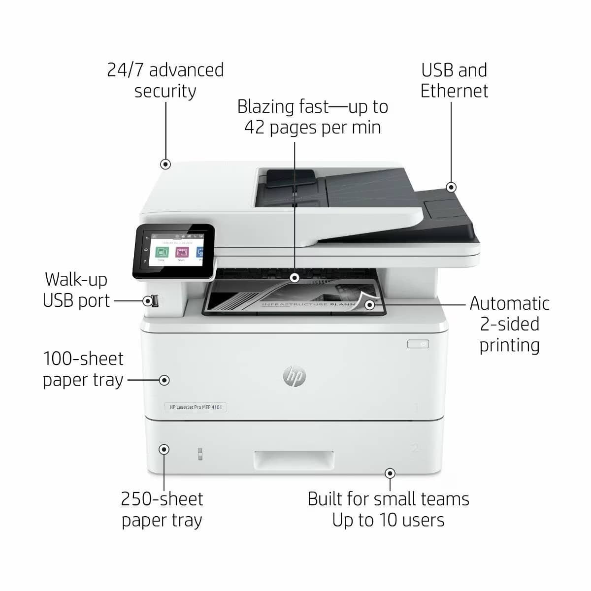 - Step up your workflow with blazing fast speeds up to 42 pages per minute, two-sided printing and scanning, and an auto document feeder.