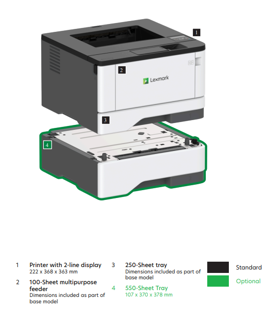 Light, compact, and fast, the B3442dw supports output up to 40 pages per minute* with wired and wireless connectivity. Available Extra High Yield Unison™ toner prints up to 6,000 pages** and optional 550-sheet tray support longer print runs. A 1-GHz multi-core processor powers through big jobs, while Lexmark full-spectrum security helps protect sensitive information.