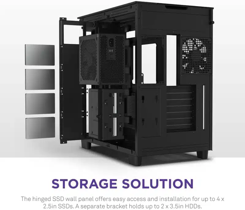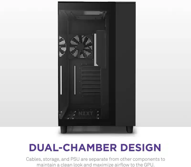 • DUAL-CHAMBER DESIGN: Cables, storage, and PSU are separate from other components to maintain a clean look and maximize airflow to the GPU.