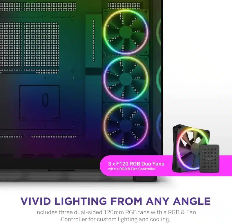 • BUILT-IN RGB LIGHTING: Includes three dual-sided 120mm RGB fans with a RGB & Fan Controller for custom lighting and cooling.